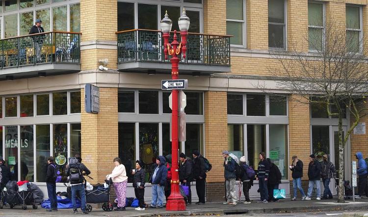 11月4日,在美国俄勒冈州波特兰,人们在街道上排队等待领取免费食物。新华社记者 吴晓玲 摄