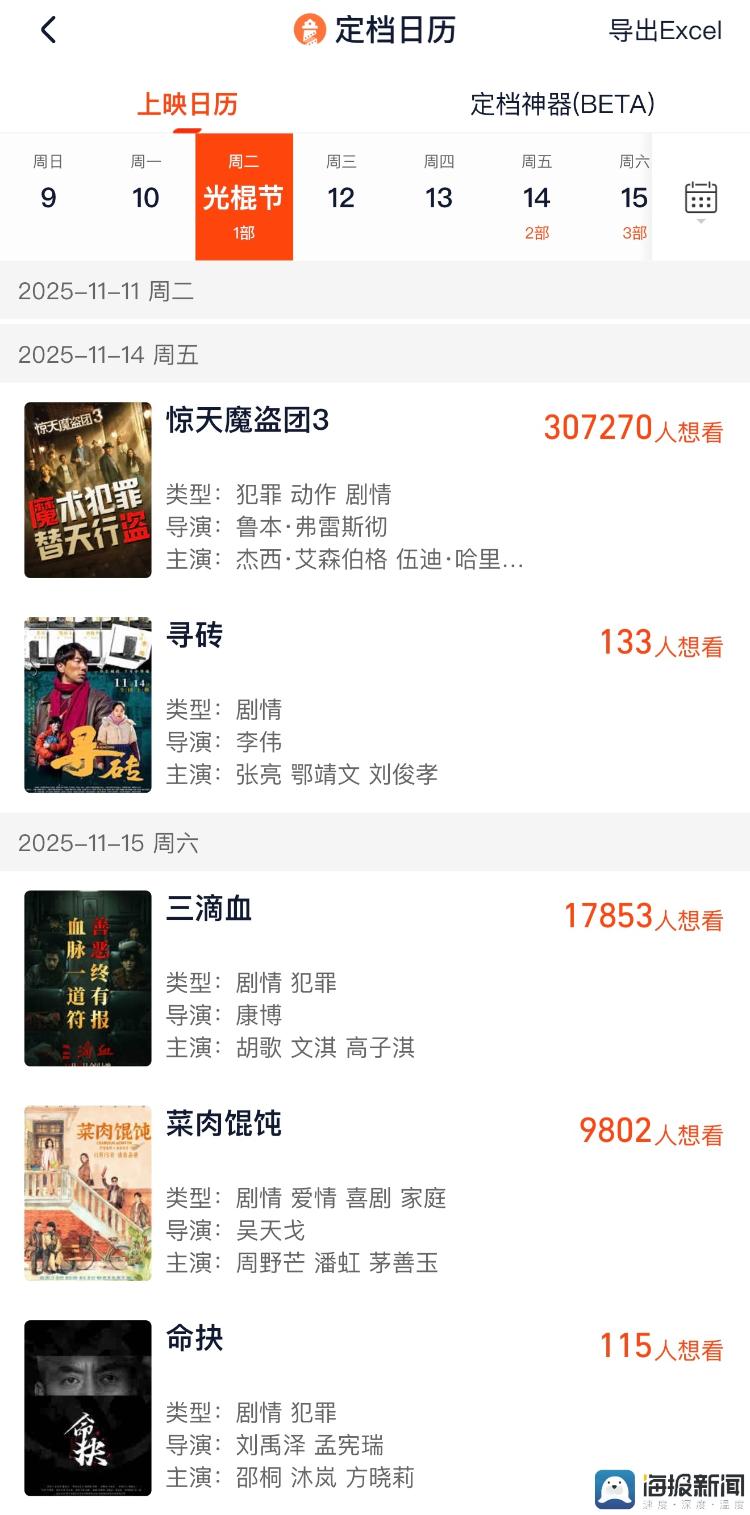 海报新闻记者秦文报道,随着10月电影市场热度的退去,2025年11月的中国电影市场很快就会迎来全年最激烈的档期竞争。据统计,11月定档新片32部。其中,《Now Now 3》和《疯狂动物城2》是强势回归的两大全球IP续作。舒淇、毕干等导演共同创作的优秀文艺作品。类型涵盖动作、动画、戏剧等多元领域,形成“商业大片带ng旗、文艺片增光彩”的格局,有望为低迷的市场注入一剂强心剂。进口大片云集,接连IP掀起视觉狂欢。正如大家所观看的商业大片一样本月,《惊天魔盗团3》将于11月14日在全国院线上映。该作品位居2025年最受期待外语片第四位,延续了《魔罪》系列的主打魅力。该片由鲁本·弗莱舍领衔主演,集结了杰西·艾森伯格、伍迪·哈里森等原著“四骑士”,同时也迎来了灯塔饰演的强力反派“钻石女王”,专业版将于11月14日上映。故事情节围绕着神奇的塔罗牌展开。两代盗贼的八位魔法师首次联手对抗“血钻石”家族背后的全球犯罪网络。一颗记载着犯罪集团黑暗历史的独特血钻成为争夺焦点,在世界各地掀起惊天抢劫案。制作方对魔法设计进行了全面升级,既保留了空中悬浮、卡牌传送等经典元素,又进行了创新融入东方传统绝招“三仙归洞”,精心设计九个高能反转,力求还原第一部的烧脑体验。 11月26日在中美市场同步上映的《疯狂动物城2》,早在淘票票“想看指数”就高达89.5万,成为本月票房最大热门。豆瓣期待已久的外语片《2025》是拜伦·霍华德和杰拉德·布什导演组合的延续。故事从新角色蛇加里的混乱介绍开始——由亚洲演员关智伟配音的爬行动物加里,因窃取《气候墙原图》古书而被通缉。在追捕过程中,朱迪和尼克发现自己被陷害,最终共同成为“逃犯”,追查阴谋。根据Beacon专业版的数据,《Zootopia 2》的“想看指数”为895,0淘宝00。在前作“草食性与肉食性”对抗的基础上,续作将“哺乳与爬行”的冲突升级。其间,通过北极鼩鼱帮绑架事件、莱克斯利家族的“空气墙”技术等情节,揭露了现实社会中的系统性歧视和阶级固化问题。制作团队使用了升级版的头发渲染系统。尼克情绪激动时,他的狐狸毛会竖起来,而朱迪的兔耳朵则经常因焦虑而抽动,使心理冲突更加引人入胜。前作票房收入15.38亿元,业内预测续集有望超越《侏罗纪世界:重生》5.67年1亿美元的好莱坞票房纪录。此外,4部进口大片是海外军团本月主力:11月1日上映的《极地冒险3》以雪橇失窃危机为中心,采用升级毛发渲染技术打造身临其境的极地场景; 《铁血战士:杀戮战场》于 11 月 7 日上映,由丹·崔切伯格执导,讲述了一名年轻铁血战士前往死亡星球的旅程的故事。艾丽·范宁的加盟增加了影片的吸引力。优秀华语片陆续上映,文艺片品质与商业大片视觉冲击力相得益彰。三部国际获奖文艺片的集中上映,让十一月市场充满人文气息。 11月1日首映的《少女》是舒淇自编自导的电影处女作。该片入围第82届威尼斯国际电影节主竞赛单元,并获得第30届布斯国际电影节最佳导演奖。影片根据舒淇的个人成长经历,讲述了1988年香港基隆女孩林小莉在迷茫中认识了李莉莉,从而找到了生命的色彩。处理家庭暴力的情节被导演称为“洋葱式的自我反转创作”。 11月7日上映的《太阳报》也有主演。蔡尚俊执导的这部作品让辛芷蕾成为继巩俐、叶德贤之后第三位获得威尼斯电影节最佳女主角的中国演员。影片的片名取自粤剧《紫钗记》的歌词。它以昔日恋人在南方小镇的重逢为标志,展现岭南的文化底蕴和普通人的精神问题。 SC蔡尚君在接受采访时表示,影片聚焦“中国人当下的生活和精神状态,值得仔细探索”。 11月22日上映的《狂野时代》,兼具艺术深度和市场潜力。毕赣导演的这部作品荣获第78届戛纳国际电影节主竞赛单元特别奖。运用“五种感官和思维”该片以《猫眼》为剧情,讲述了一个女人潜入沉迷于幻觉的怪物梦境,在人们不再做梦的世界寻找真相的故事。由易烊千玺主演的演员阵容,让电影“猫眼”的“想看”人数突破了20万。诗意的镜头和语无伦次的想象被影迷称为“不容错过的光影之旅”。华语类型片也有不少亮点: 11月15日上映的胡歌、文琪主演的《三滴血》,聚焦家庭人口拐卖的黑暗链条;11月5日上映的纪录片《白马姐妹》,记录了白马村四位藏族姐妹24年来经历两次洪水的人生轨迹,展现了人性在时代变迁中的坚守,口碑是爆款的关键。 11月电影市场被业界看好成为扭转10月份市场颓势的关键。 10月份,《创:战神》等好莱坞大片的投资与票房成反比。 《战地》尽管有巨星在场,但反响依然冷淡,反映出观众对常规内容的厌倦。 《疯狂动物城2》、《狂野时代》等影片的高期待,证明了“优质供给决定市场热度”的规律。对于普通观众来说,11月份的观影选择层次分明:寻求视听刺激的可以期待《惊天魔盗团3》和《铁血战士:杀戮》的魔幻奇观。 “土地”的硬核动作;喜欢情感共鸣的人可能会在《少女》和《日出》中找到精神上的联系;家庭观众将《疯狂动物城2》视为首选。影院从业者表示,影片多元化的结构有望覆盖各个年龄段的观众,推动票房复苏。来回在历届IP的持续热度与文艺片的不凡品质的衬托下,11月的电影市场书写了一幅“百花齐放”的市场画卷。正如业内人士所说,当商业大片回归创作本质,当文艺片获得市场关注,中国电影市