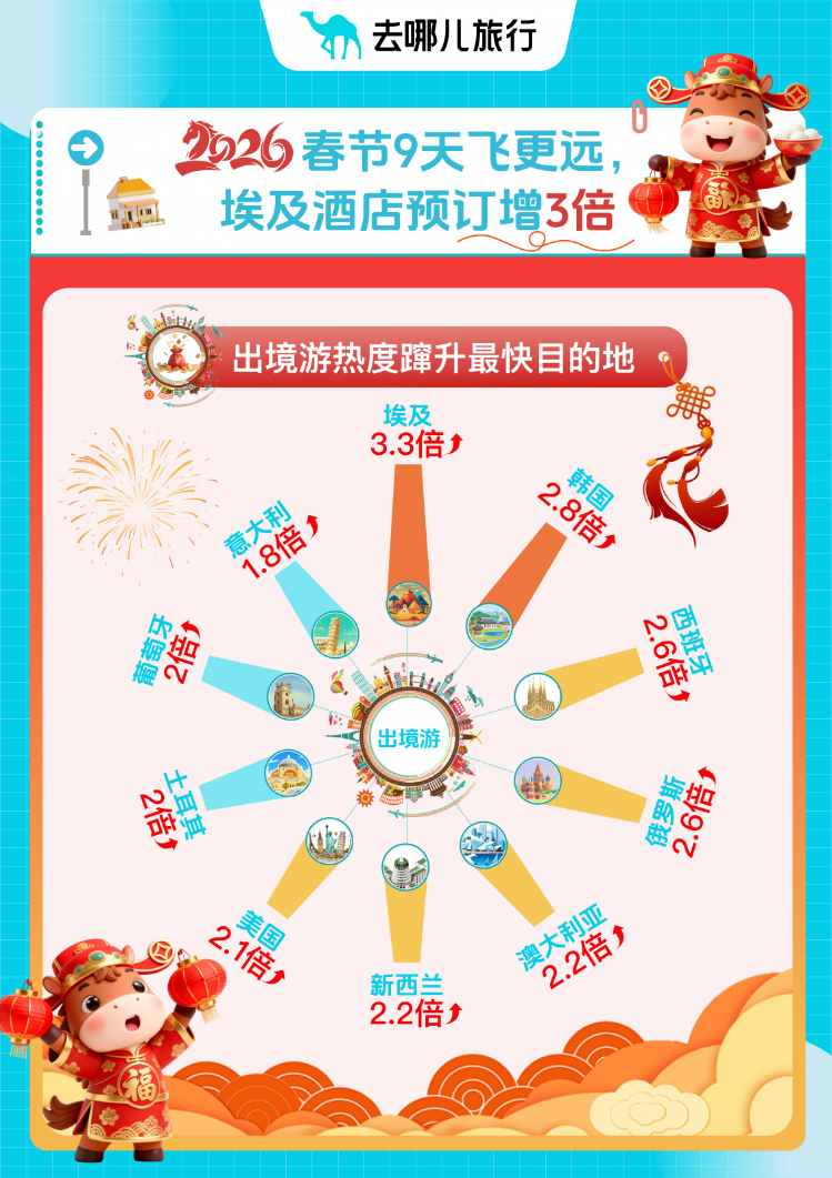 海报新闻记者李金山首席记者张一凡报道,2026年春节假期将持续9天,推动旅游节目热度超过2025年春节。数据显示,2026年出境游机票、酒店预订将达到高峰。热门出境旅游目的地的酒店预订量增长了一倍多;更多人选择在长假期间出游,且节前和节中存在两个出境高峰。也有人“趁着假期”提前出发,享受更优惠的票价。越南、韩国、印尼、泰国、马来西亚属于热门低价区间,单程票低于1500元;澳大利亚、新西兰、美国、埃及、阿联酋等地属于低人口高物价梯队;老挝、尼泊尔、乌兹别克斯坦、格鲁吉亚、哈萨克斯坦等目的地处于不“乌鸦”的高性价比区其中,前往老挝的国内机票不到1000元就可以买到。从2026年春节和2025年春节出境机票价格对比来看,仍有一些大幅下降的目的地可能被“错过”:摩洛哥平均机票价格比去年同期便宜一半以上;捷克、塞尔维亚、肯尼亚、奥地利、俄罗斯等地的机票价格大幅下降。爱尔兰每年便宜30%以上,泰国、韩国、马来西亚是2026年春节期间最受欢迎的酒店预订量,泰国、韩国、马来西亚、越南、新加坡、印度尼西亚等东南亚短途目的地由于距离短,仍然是首选。便捷的出行成本、友好的签证政策、适宜的气温,满足了春节假期轻松出行的需求。 9天假期,“会玩”的人也更加坚持。 2026年春节出国旅游,长线目的地热度大幅提升。人气增长最快的前10个目的地中,除了韩国外,都是偏远目的地。其中,埃及以酒店预订量增长3.3倍领先,西班牙、澳大利亚、土耳其、葡萄牙等长期目的地国家的酒店预订量也增长了2倍以上。趁着春节看世界的机会,有人北上极地去追逐极光。挪威的酒店预订量增长了1.5倍,跻身最热门出境游国家前20名。有些人飞往南半球去避暑新西兰的岛屿和酒店预订量增加了两倍多。春节出国旅游的游客中,有一半是23-40岁的上班族。有很多适合亲子游玩的“亲子游”,18岁以下青少年票价为15%。 23-40岁的上班族将是2026年春节出境游的绝对主力,其中伊藤年龄段占比过半,合计占比55%。其中,31-40岁既有消费能力又有出行意愿的人群占比最高,达到31%,同比增长90%以上; 23-30岁的年轻上班族增长最快,预订量增幅超过1.2倍,成为春运出境游市场增长的主要动力。此外,18岁以下的儿童和青少年需加收15%的费用。这种团体旅游往往以家庭为主导,亲子游占比较高。根据目前的情况拱门和预订量,新西兰皇后镇TS,S厄恩斯劳轮船成为春节期间最受欢迎的外国美景。 2月底,中国的伊藤是寒冷的冬天,但南半球的新西兰却是温暖的。登上这艘与泰坦尼克号“同龄”的百年轮船,游客可以在装饰有新年装饰的牧场庄园享用团圆饭,体验新西兰独特的当地活动,观看牧羊犬放羊、剪羊毛表演,过一个既仪式感又新鲜的新年。去哪儿旅游数据显示,新西兰皇后镇轮船景区与澳大利亚塔龙加动物园、新加坡环球影城并列春节期间出国游最受欢迎的前三旅游景点。