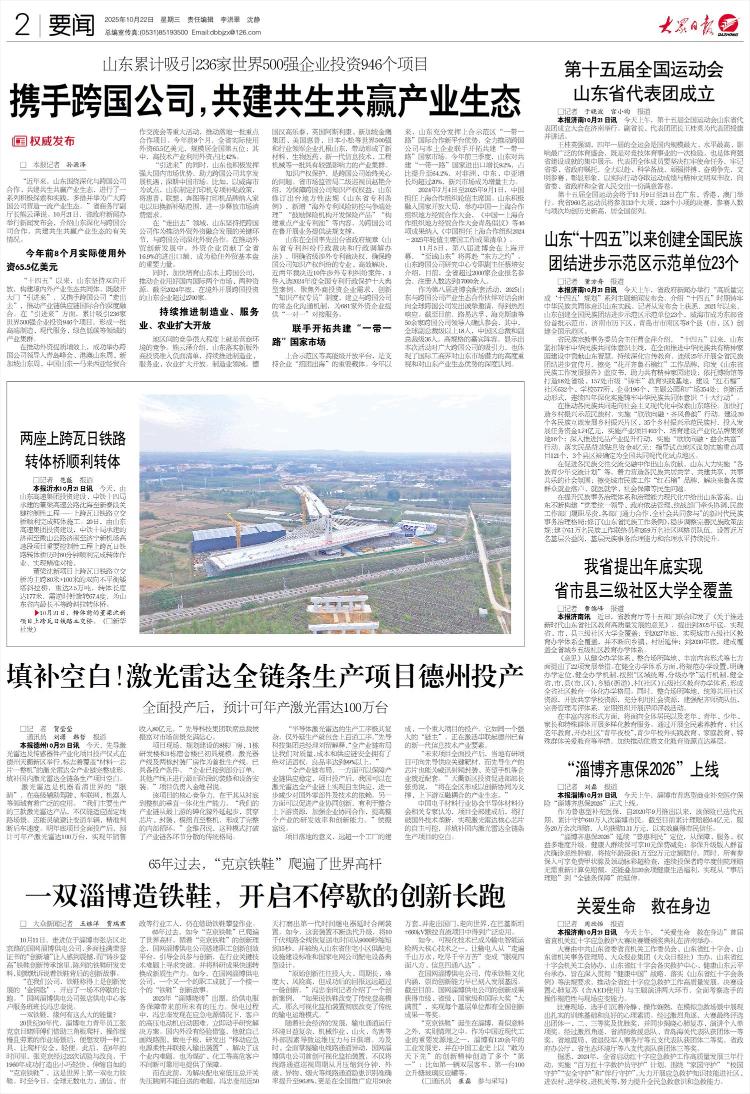 □记者孙元泽 “近年来,山东围绕深化与跨国公司合作、共建标志性共赢产业生态进行了一系列积极探索和实践,多举措打造跨国公司产业生态。”省商务厅副厅长熊云泽说。 10月21日,省政府新闻办召开新闻发布会,介绍山东深化与跨国公司合作、构建标志性共赢产业生态的情况。今年前8个月实际使用外资65.5亿美元。 “十四五”以来,山东沿着双向开放,打造国内外产业生态共同体。不仅打开“带进来”的大门,也携手跨国企业“走出去”,推动国际合作深度融合产业链和供应链的配给。在“承载”上,共吸引236家世界500强企业投资946个项目,在高端制造、现代服务业、绿色低碳等领域形成了一批产业集群。在促进外资提质增效方面,成功举办跨国公司领导人青岛峰会、港澳山东周、新加坡山东周、中国山东—马来西亚经贸合作交流会等重大活动,推动一批重大合作项目落地。今年前8个月,全省实际利用外资65.5亿美元,位居全国第五;其中,高新技术产业占外资的42%。 “扛”的同时,山东还积极利用国内市场的强大优势,助力跨国企业共享发展机遇并从中国市场起飞。比如,山东以威海市为试点,制定了打印机专项补贴政策,将惠普、联想、奔图等打印机品牌纳入内贸补贴范围,进一步带出了市场的消费需求。在“走出去”领域,山东坚持把跨国公司作为推动外贸和外资联动发展、深化与跨国公司的外贸合作的关键环节。推进对外贸易现代化发展,外商投资企业贡献全省进出口额16.9%,成为稳定外贸主市场的重要力量。同时,加快培育山东本土跨国公司,推动企业利用国内国际市场和资源。到2024年底,将有山东省境外跨境投资企业超过2700家。继续推动制造业、服务业、农业开放。区域之间的竞争很大程度上是营商环境的竞争。熊云泽表示,山东实施新的外商投资准入负面清单,持续推动制造业、服务业、农业开放。在制造业领域,德国汉高乐泰、英国阿斯利康、新加坡金鹰集团、美国惠普、日本小松等世界500强和行业龙头在山东扎根,形成了新材料、生物医药、新一代信息技术、工程机械等一批极具影响力的产业集群。知识产权保护是跨国公司始终关注的问题。二级巡视员 赵岩省市场监管局出台了保护跨国公司知识产权的措施,增加了“境外专利重新上市防控与结算”、“鼓励保险机构开发保险产品”、“为重点产业发展一层”等新内容,为山东跨国公司开展业务提供监管支持。山东在全国率先颁布省级政府规章《山东省专利纠纷行政审判和行政调解办法》,明确了涉及审判权的省级省份,保障了涉及知识产权的知识产权纠纷专业高效解决。跨国公司。两年来,审结涉外专利案件近10件,1件案件入选全国十大典型案例2024年全面实施专利行政保护。围绕外商投资企业制度需求,修改“知识产权专员”制度,建立与跨国公司定期沟通机制,为681家外商投资企业提供“一对一”对接服务。共同开拓、共建“一带一路”国家市场。上合示范区等高能开放平台是支持企业“抱团出海”的重要载体。今年以来,山东充分发挥上合示范区作为“一带一路”国际合作新平台的优势,全力推动跨国公司和本土企业联手开拓“一带一路”沿线国家市场。今年前三季度,山东省对共建“一带一路”国家进出口“公路”增长9.2%,占比64.2%。山东对非洲、中东、中亚进出口均增长20%以上,新兴市场成为增长主要动力。2024年7月4日至2025年9月1日,我国担任上海合作组织轮值主席国。山东积极参与国家总体开放,举办中国—上海 合作组织地方经贸合作会议。 《中国—上海合作组织地方经贸合作会议·青岛倡议》等46项成果被列入《上海合作组织2024-2025年轮值主席国工作成果清单》。 11月5日,第八届进博会在上海开幕,“真诚山东”将再赴“东方无极”。蔡 山东省跨国公司研究中心专职副主任裴安表示,目前,超过全省已有2000家企业报名参会,注册人数超过17000人。作为第八届进博会的配套活动,2025山东省与跨国企业产业生态合作伙伴对话向全球跨国企业发出诚挚邀请,得到热烈反响。截至目前,路易达孚、海克斯康等超过50家跨国公司负责人已确认参会,其中全球总裁及以上18位,中国区总裁、副总裁36位。高规格的嘉宾阵容体现了本次活动对跨国公司的吸引力,也体现了国际社会对山东市场潜力的高度重视和对山东产业生态优势的深刻认可。